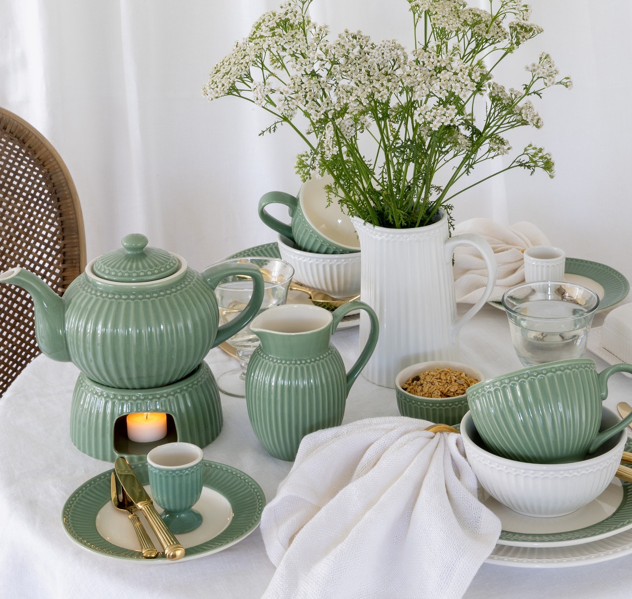 Hübscher Becher mit Henkel Alice dusty green in gedecktem Grün von GreenGate aus der Serie Everyday. Der Becher in Grün hat ein schlichtes Design mit Rillen-Struktur und ist ideal als Kaffeebecher, aber auch für Tee und andere köstliche Getränke. Der Becher Alice dusty green lässt sich bestens kombinieren mit den blumigen GreenGate Geschirr Serien.