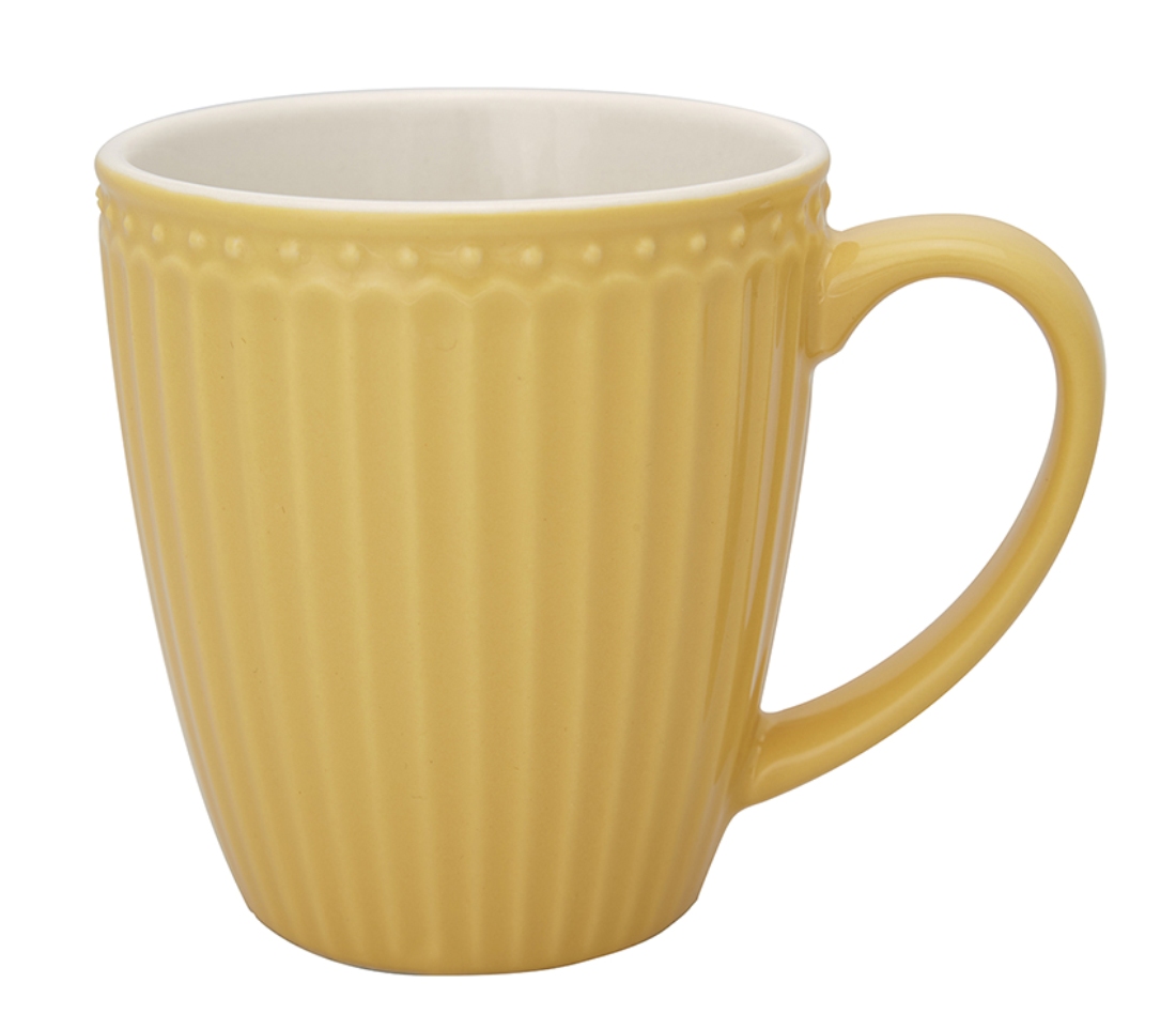 Hübscher Becher mit Henkel Alice honey mustard in senfgelb von GreenGate aus der Serie Everyday. Der Becher in Gelb hat ein schlichtes Design mit Rillen-Struktur und ist ideal als Kaffeebecher, aber auch für Tee und andere köstliche Getränke. Der Becher Alice sky blue lässt sich bestens kombinieren mit den blumigen GreenGate Geschirr Serien.