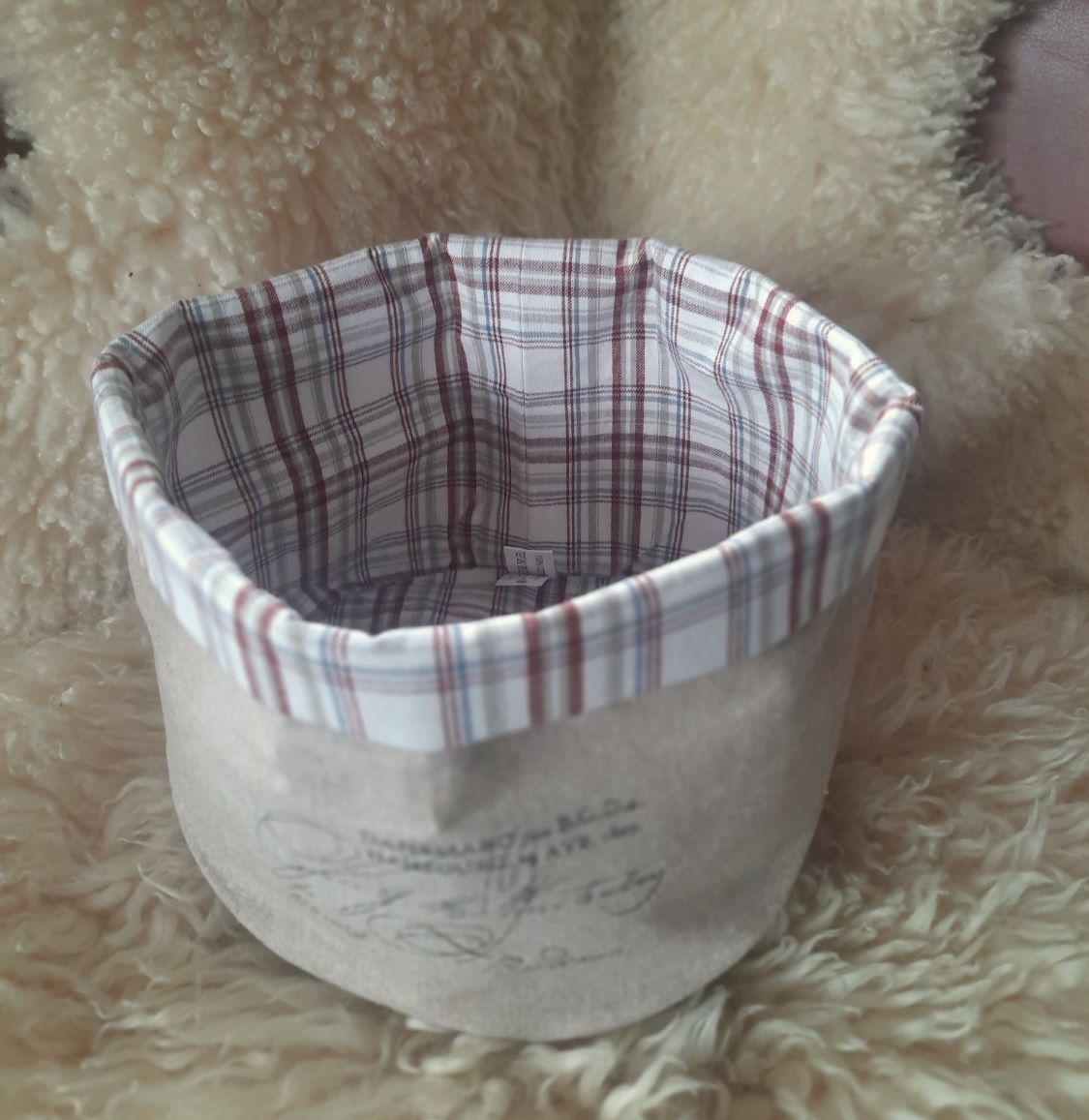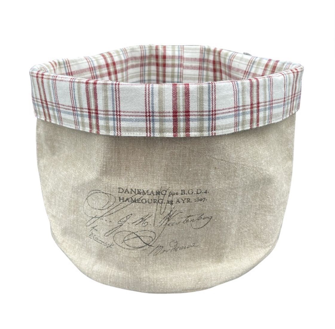 Brotkorb im Landhausstil aus Stoff im Leinen-Look mit nostalgischem Schriftzug. Der Stoff-Korb aus reiner Baumwolle ist außen beige und innen creme-beige-rot kariert. Er ist perfekt für das gemütliche Frühstück mit frischen Brötchen und anderen Backwaren.