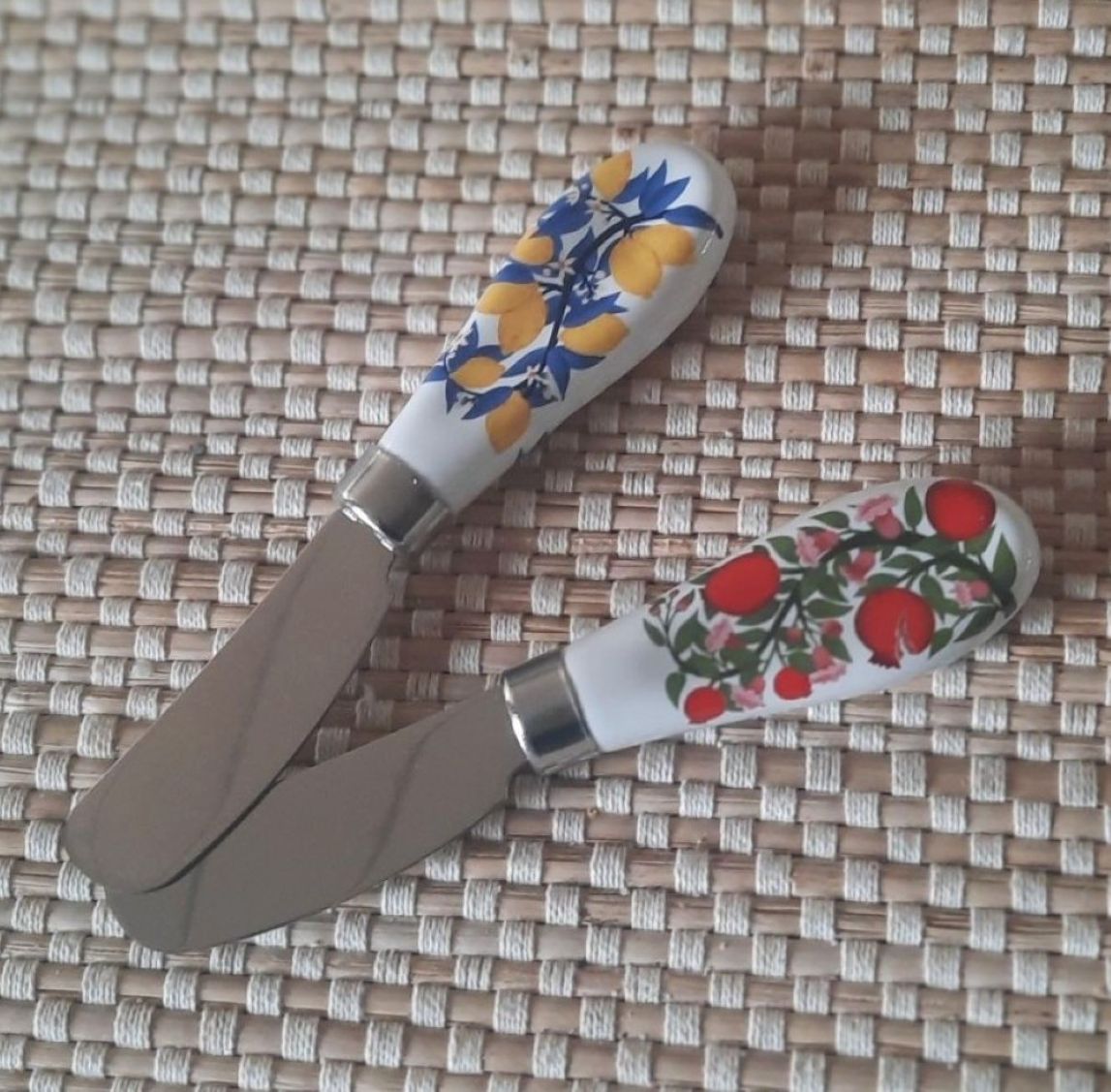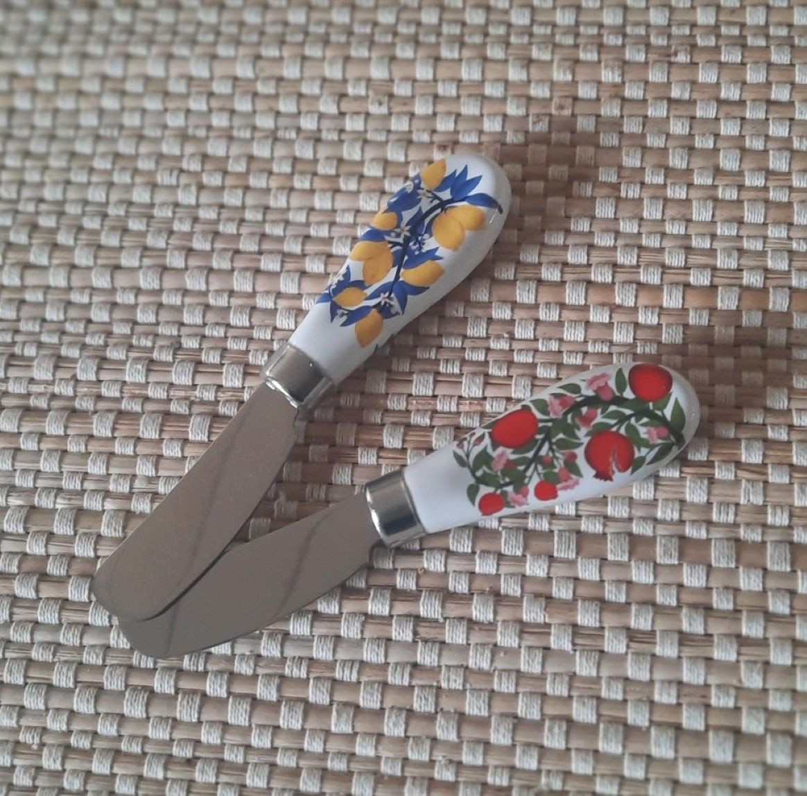 Hübsches kleines Buttermesser mit Edelstahl-Klinge im 2er-Set. Die Buttermesser haben einen dekorativen Griff aus Keramik mit unterschiedlichen Früchten als Muster. Die Buttermesser haben eine abgerundete stumpfe Klinge und sind nicht zum Schneiden geeignet. Sie sind perfekt für Butter, Frischkäse, Pasteten und cremige Aufstriche. Mit einem kleinen Buttermesser können diese Zutaten stilvoll aus dem Gefäß entnommen werden und auf Brot, Gebäck und Chips etc. verteilt werden. Beim Frühstück, Brunch oder Abendessen ist ein Buttermesser immer ein praktischer Begleiter.