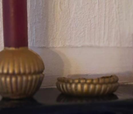 Hübsche Stabkerze in elfenbein mit goldfarbenem Unterteil. Die dekorative Kerze in hellem Creme benötigt keinen Kerzenständer, sie ist selbstlöschend und perfekt als Tischdeko zu fast jeder Gelegenheit, auch als Deko in der Advent- und Weihnachtszeit verfehlt sie nicht ihre Wirkung.