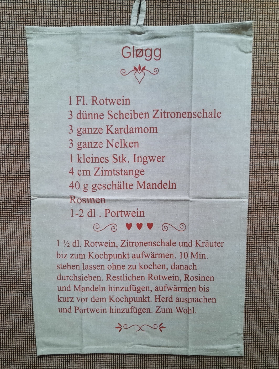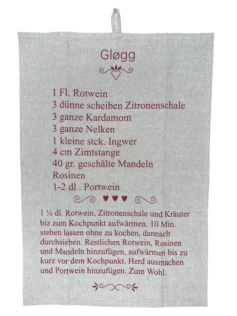 Geschirrtuch in beige und in roter Schrift ein leckeres Rezept für Glögg, der skandinavischen Glühwein-Spezialität. Gløgg ist ideal für die kalte Jahreszeit, er wärmt von innen, schmeckt hervorragend und vermittelt ein bisschen Dänemark-Feeling.