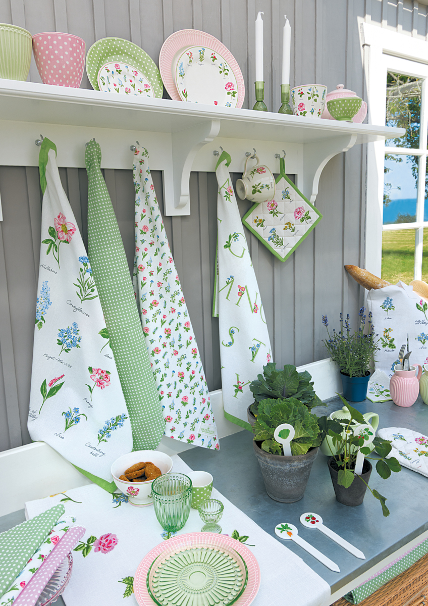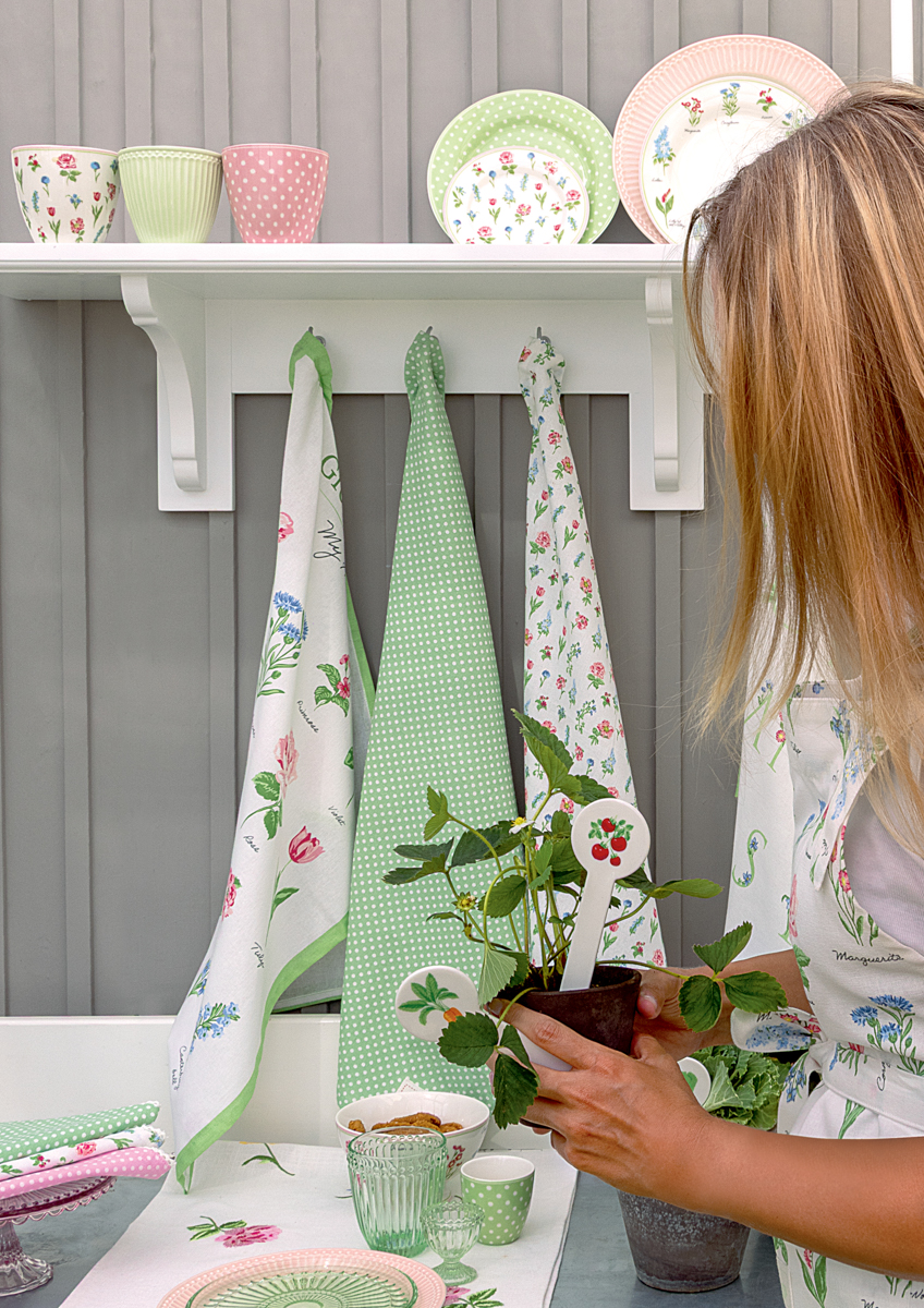 Hübsches GreenGate Geschirrtuch Estrid in weiß mit Blumen-Motiv in Rosa und Blau und grünen Blättern.. Ein Geschirrtuch für fröhliches Ambiente in der Küche.