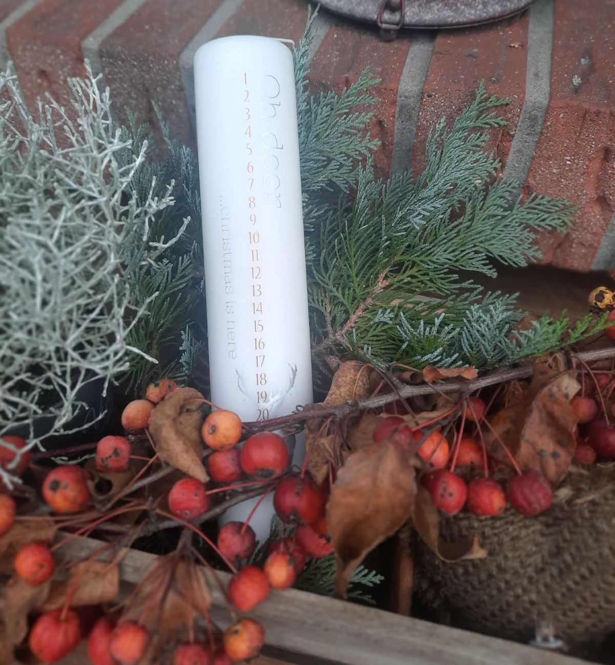 Dänische Kalenderkerze, Adventskerze "Oh deer" mit Zahlenskala von 1 bis 24 und Rentiere als Motiv. Für jeden Tag ein bisschen Kerzenschein in der Adventszeit. Die Adventskerze hat eine Brenndauer von ca. 56 Std., 25 cm hoch, D 5 cm.