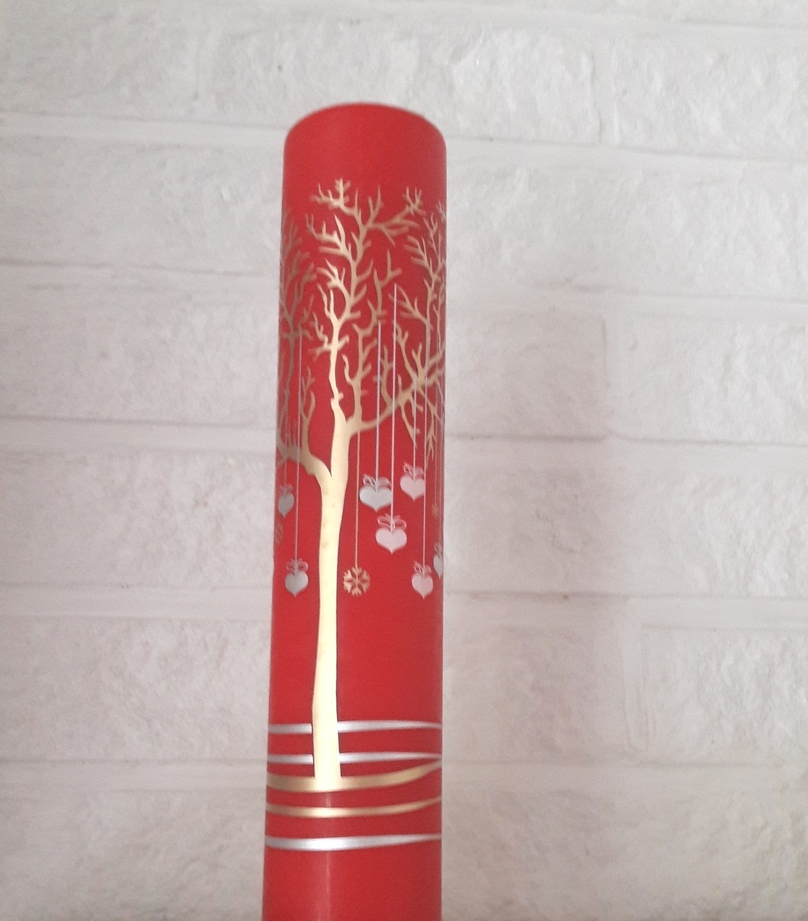 Dänische Kalenderkerze in Rot mit goldener Zahlenskala von 1 bis 24 und hübschen Advents- und Weihnachtsmotiven, goldener Baum mit Herzen. Für jeden Tag ein bisschen Kerzenschein in der Adventszeit. Die Kalenderkerze hat eine Brenndauer von ca. 56 Std., 25 cm hoch, D 5 cm.