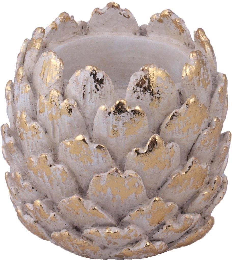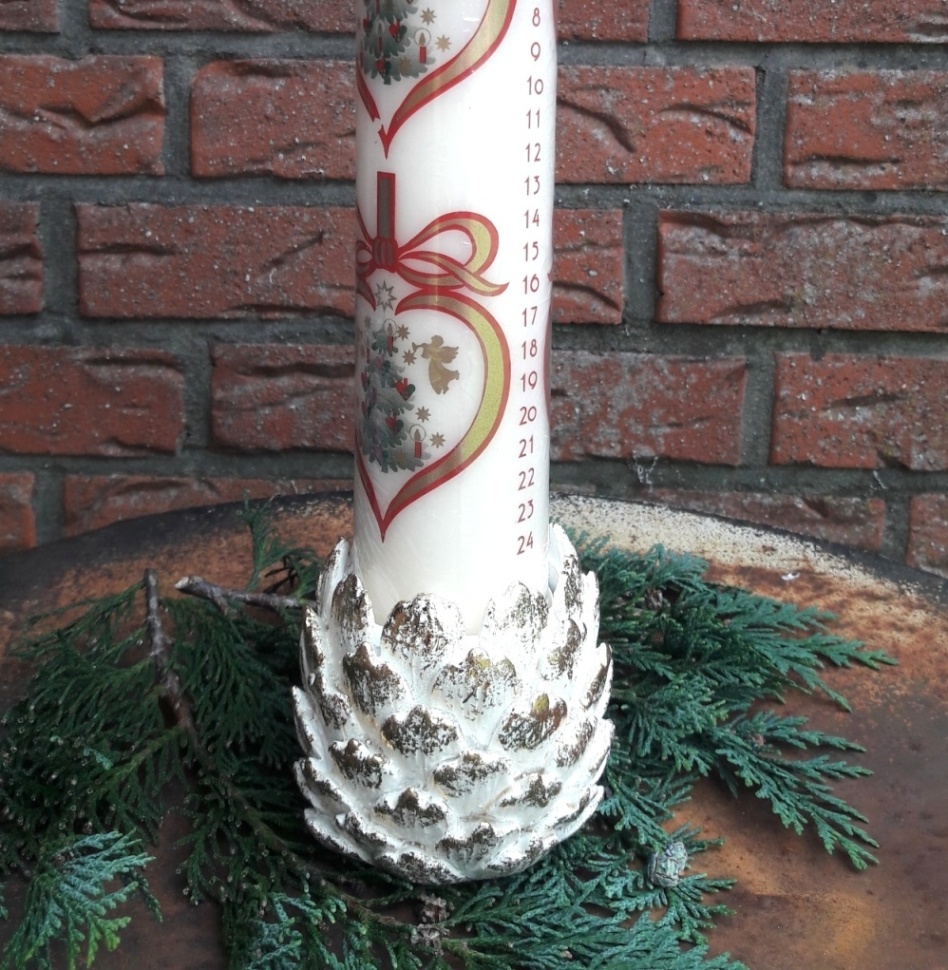 Kerzenhalter als Zapfen in Weiß-Gold für Kerzen bis zu einem Durchmesser von 5 cm.