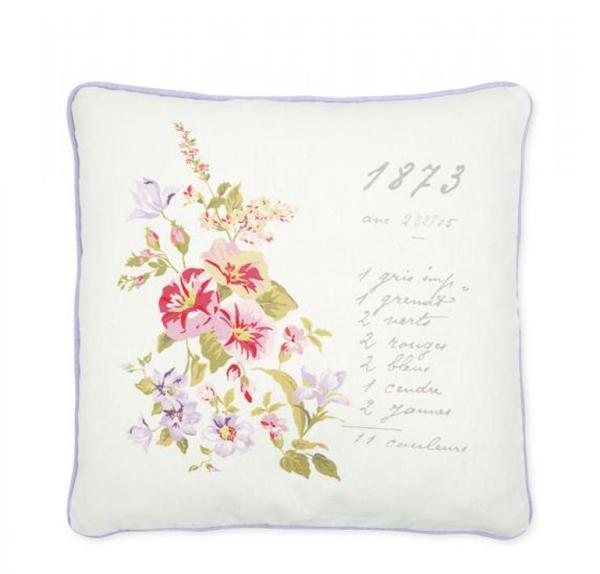 Kissen-Bezug Jacobe white von GreenGate in Weiß mit Blumenmuster und Schriftzug in hübschen Farben, perfekt als Sofakissen oder Kuschelkissen. Das Kissen ist rundherum eingefasst in flieder-lila. 100% Baumwolle Maße: 40 x 40 cm 40° Wäsche