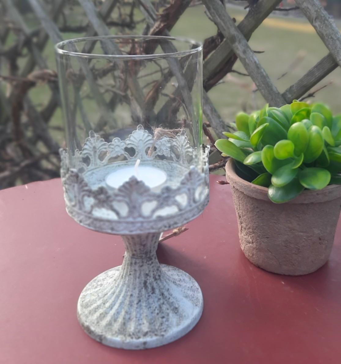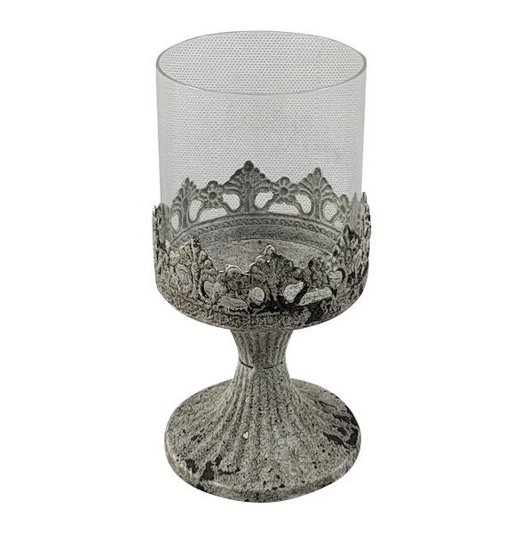 Hübsches kleines Windlicht in shabby weiß-grau mit abnehmbarem Glas und nostalgischer Metalleinfassung und dekorativem Fuß. Das Windlicht im Shabby-Stil ist geeignet als Teelichthalter für kleine und große Teelichte sowie für kleine Kerzen. Hergestellt in Handarbeit.