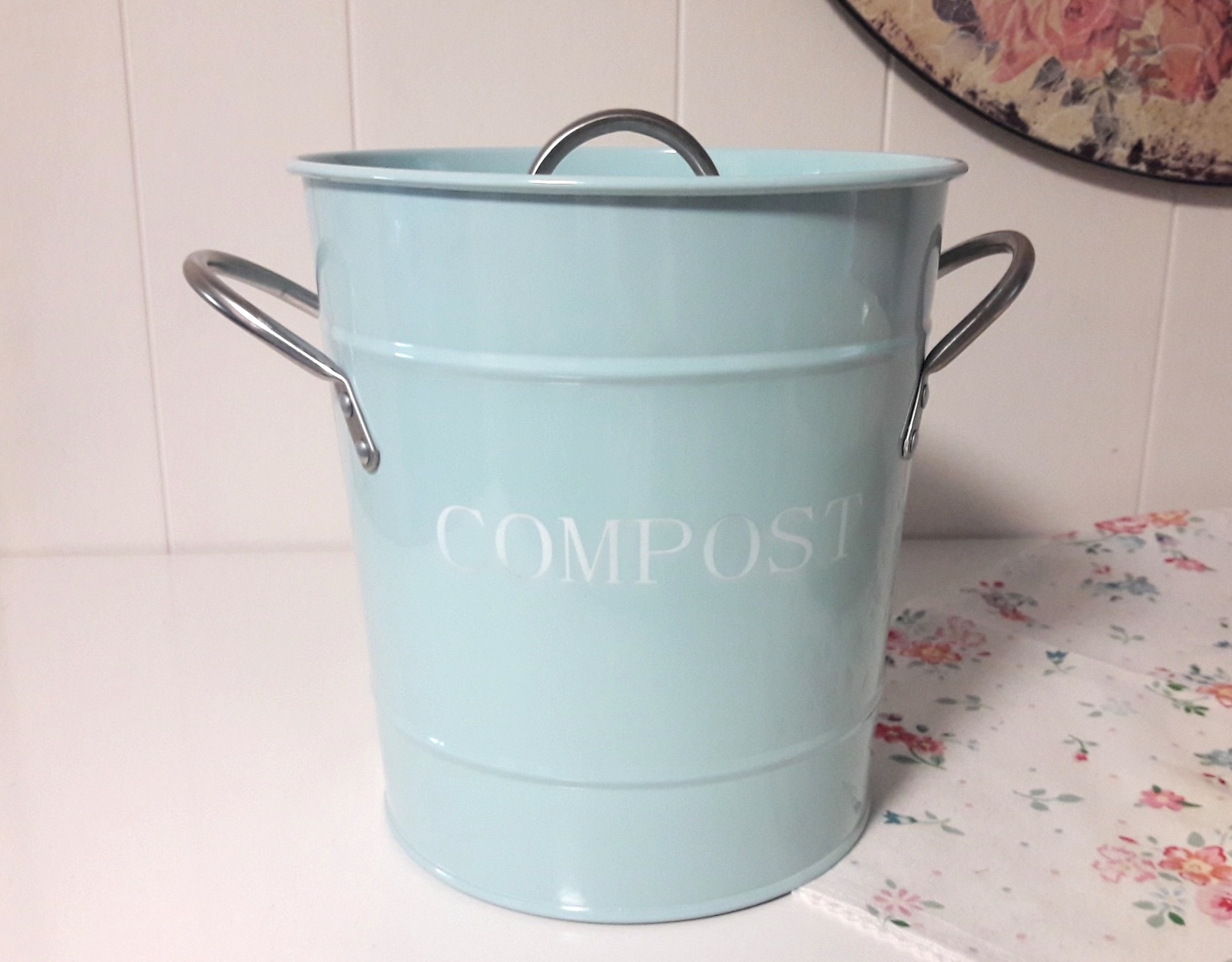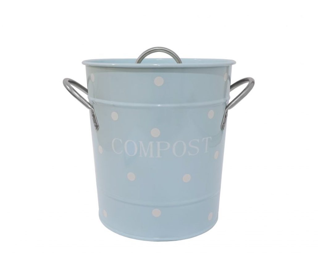 Komposteimer in hellblau aus Metall mit Deckel und Griffen für Küchen-Bioabfall, z.B. Obst- und Gemüseschale, Kaffeesatz etc.! Der Komposteimer hat einen herausnehmbaren separaten 3 Liter Kunststoffbehälter für eine einfache Reinigung. Der Mülleimer ist hellblau und kann wahlweise mit den beigefügten weißen Punkten beklebt werden.