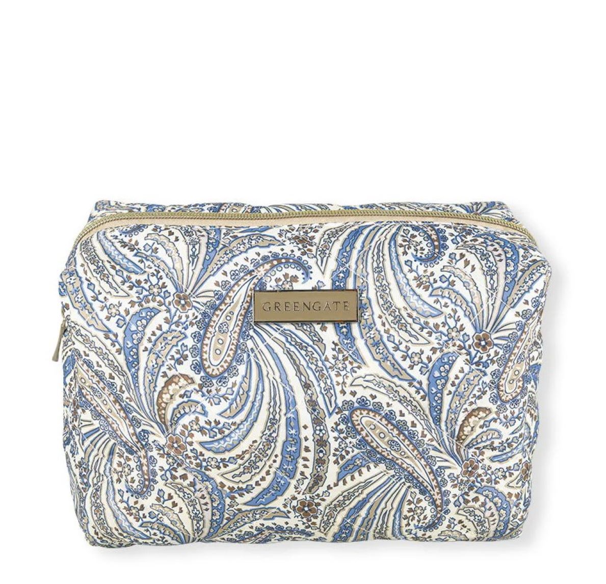 Hübsche Kulturtasche Elva von GreenGate mit trendigem Paisley Muster in Blau-Beige Tönen und goldenem Reißverschluss. Die Kulturtasche besteht aus einem großen Innenfach, das Futter ist beige-weiß gestreift. Ein Kulturbeutel für viele Pflegeprodukte auf Reisen oder im Bad, auch als Kosmetiktasche ideal.