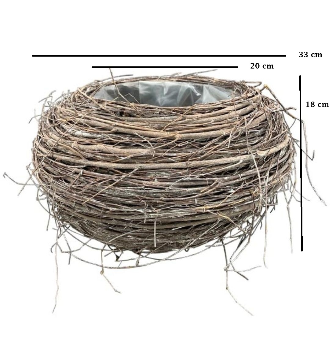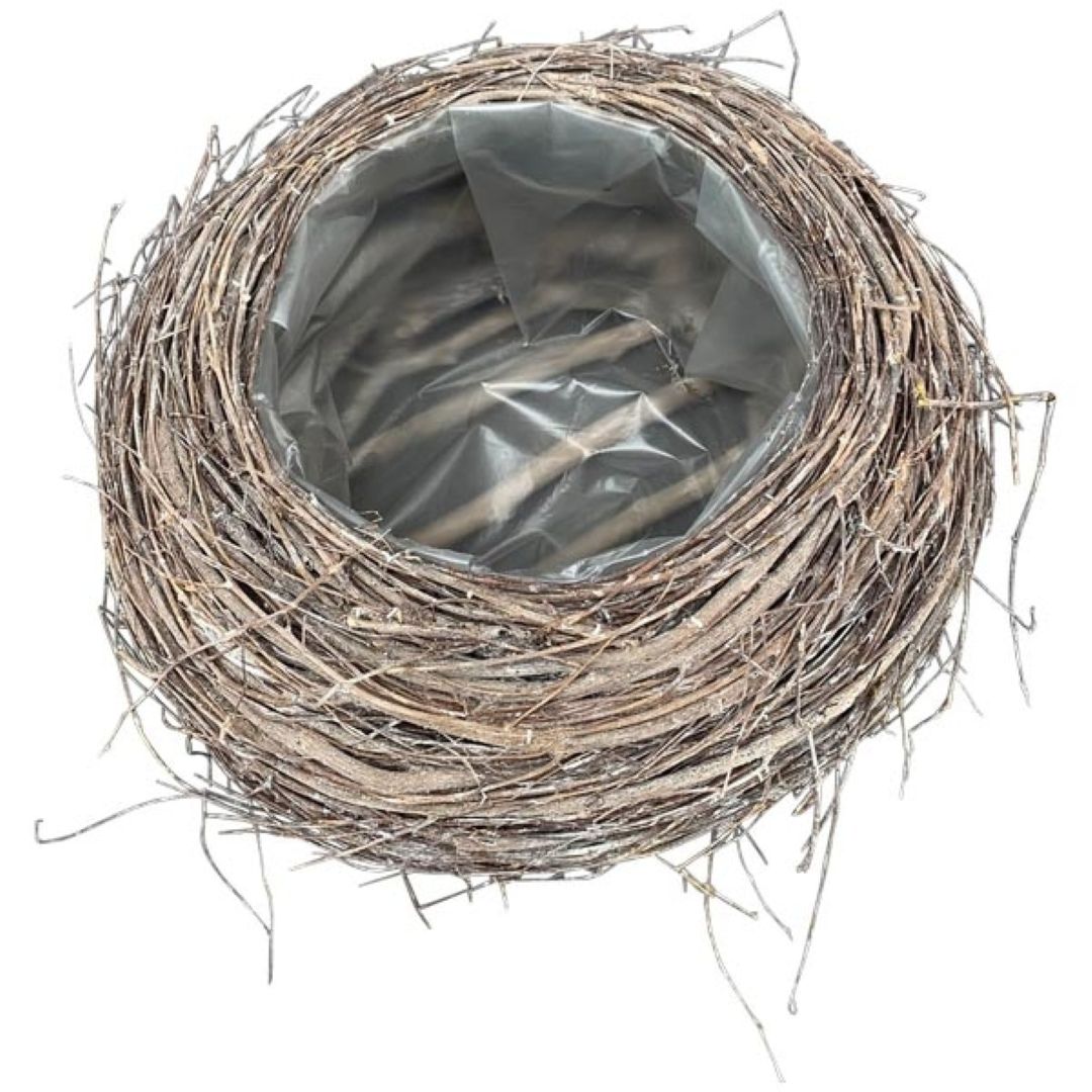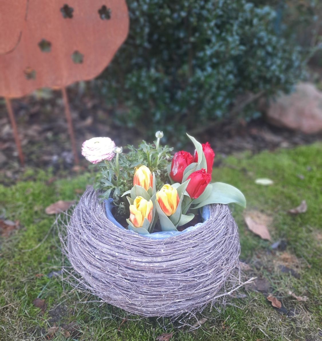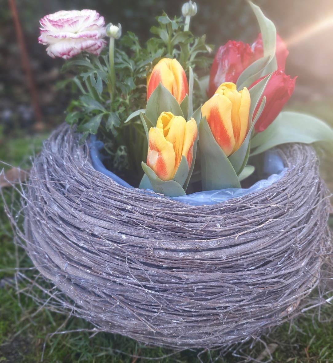 Großer runder Reisig-Korb als Pflanzkorb für Blumen im rustikalen Landhausstil. Der Korb ist mit Folie ausgeschlagen und hübsch bepflanzt ist er die perfekte Gartendeko mit ländlichem Charme.