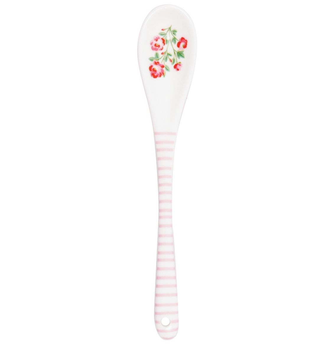 Der GreenGate Löfffel Liana white aus Porzellan mit zauberhaften Blumen und rosa Streifen ist ein hübscher Kaffee-, Zucker- und Marmeladen-Löffel, der sehr gut zu vielen GreenGate Geschirr Serien passt. Länge 15,5 cm spülmaschinen- und mikrowellengeeignet