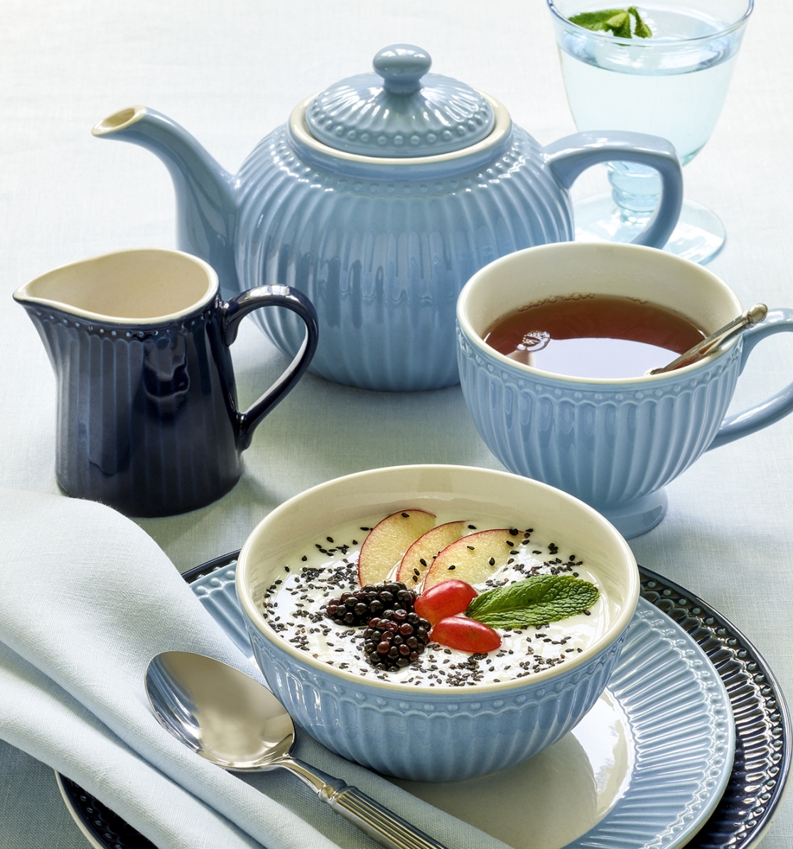 Hübsche Schale Alice sky blue von GreenGate aus der Serie Everyday. Die Schale aus robustem Porzellan in frischem Blau hat ein schlichtes Design mit Rillen-Struktur und Perlenoptik am Rand. Diese Schale in himmelblau ist ideal für eine Kombination mit den blumigen GreenGate Geschirr-Serien und perfekt geeignet für Müsli, Obst, Salat und vieles mehr.