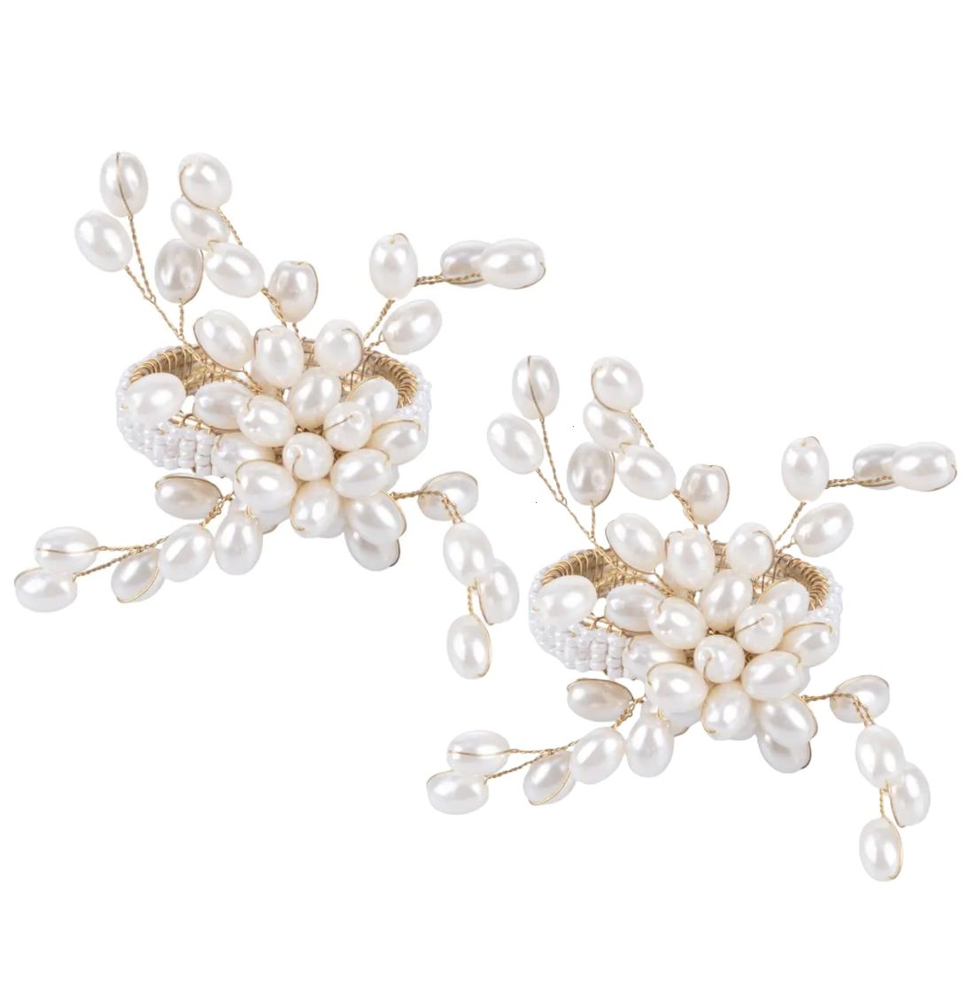 2 Serviettenringe aus Metall in elegantem Gold mit weißer Perlen-Blüte mit Vintage-Charme. Die Perlen können beliebig gebogen werden, so gestalten Sie die Blüte ganz nach Ihren Wünschen. Mit hübschen Servietten sind diese Serviettenringe eine Augenweide auf Ihrem gedeckten Tisch und sorgen für stilvolles Tischambiente.
