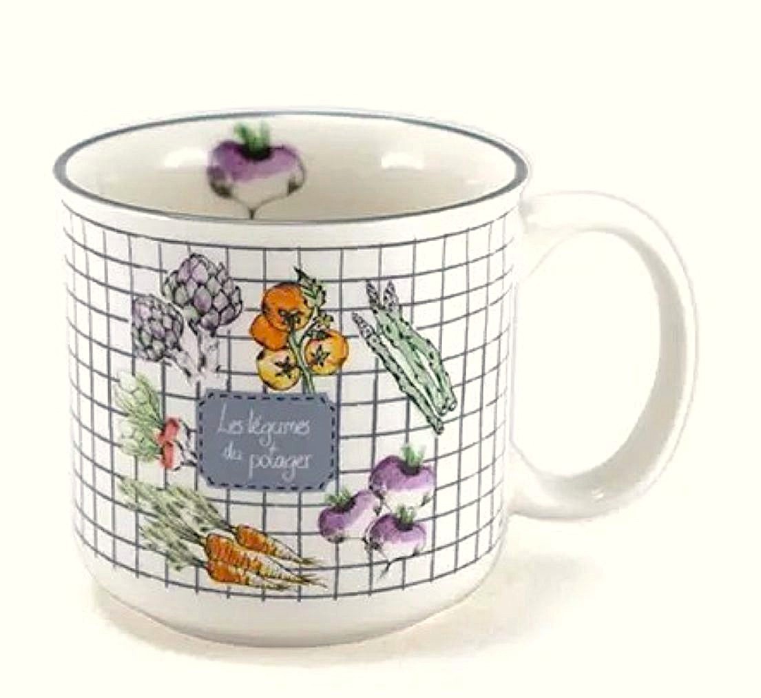 Hübsche Tassen mit dekorativem Gemüse Dekor und kleinem Innenmotiv. Die Tassen sind perfekt als Frühstückstasse für Kaffee, Tee und andere köstliche Getränke.
