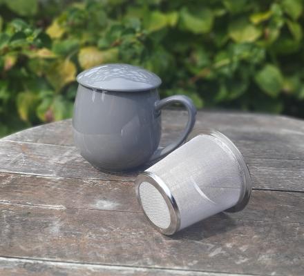 Hübsche Teetasse in schickem Grau in edel glänzendem einfarbigem Design. Die Kräuterteetasse hat ein Sieb-Einsatz und ist daher ideal für die Tasse Tee zwischendurch, frisch aufgebrüht, im Büro ebenso wie zuhause. Der praktische Deckel sorgt dafür, dass der Tee schön heiß bleibt und das Aroma behält.