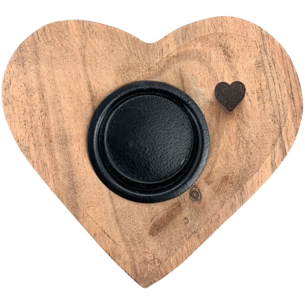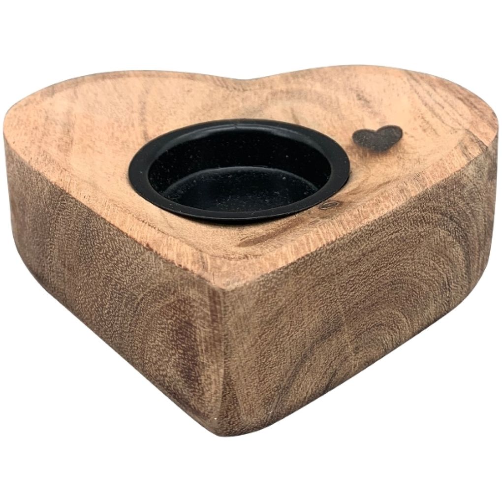 Hübscher Teelichthalter aus Holz in Herz-Form für stimmungsvolles Licht. Ein sehr dekorativer Teelichthalter mit zusätzlichem kleinem Herz als Verzierung, der auch als Tischdeko zu jeder Jahreszeit passt. Drei kleine Gumminoppen am Boden, um Kratzer auf der Stellfläche zu vermeiden.