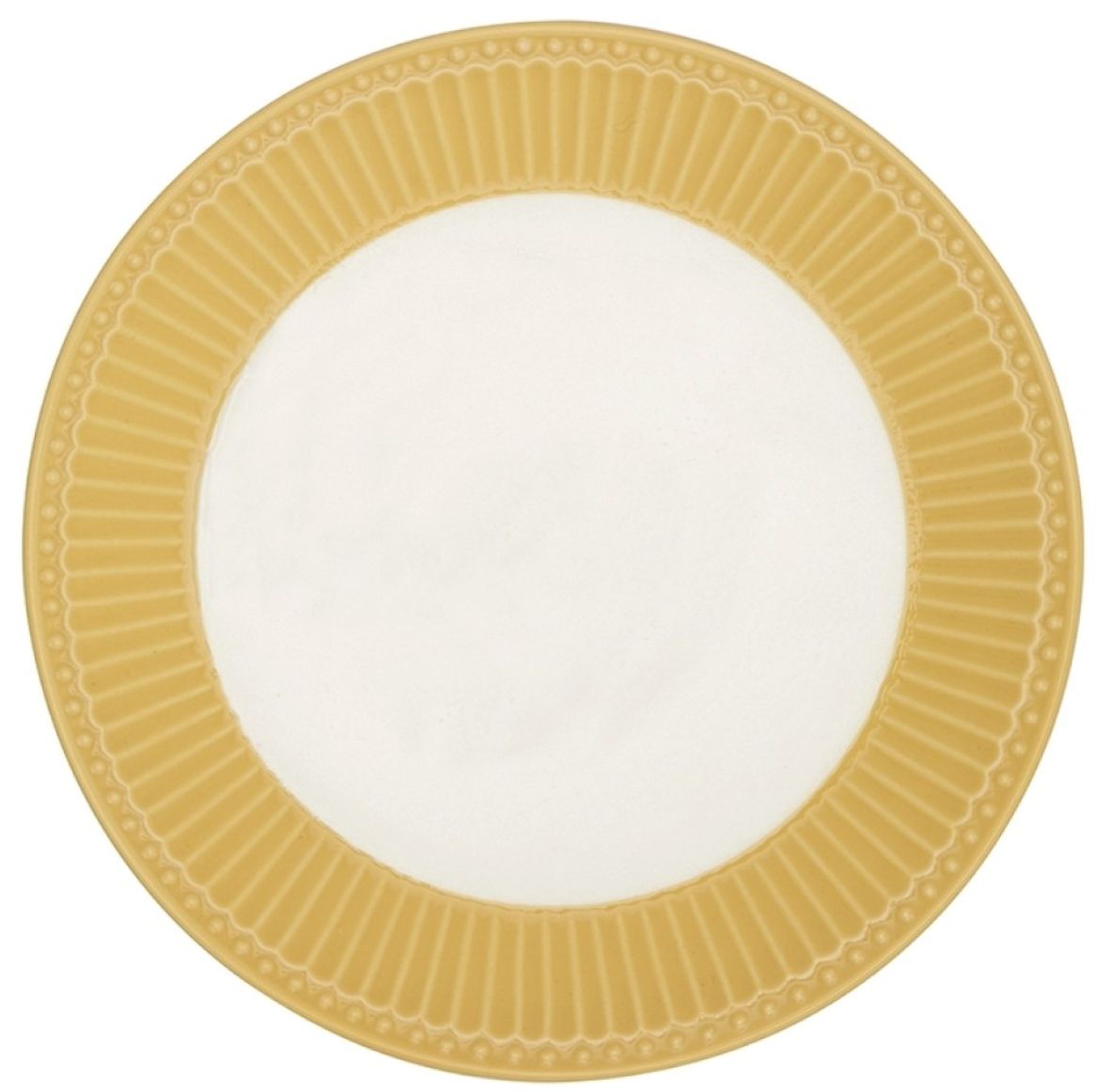 Teller Alice honey mustard in gelb von GreenGate aus der Serie EVERYDAY. Der Teller hat ein schlichtes Design mit hübscher Rillen-Struktur in senfgelb. Dieser Teller ist toll zu kombinieren mit den blumigen GreenGate Geschirr-Serien und bestens geeignet als Kuchen- oder Frühstücksteller. Verleihen Sie Ihrem Frühstückstisch eine frische Note mit der GreenGate Alice honey mustard Serie.