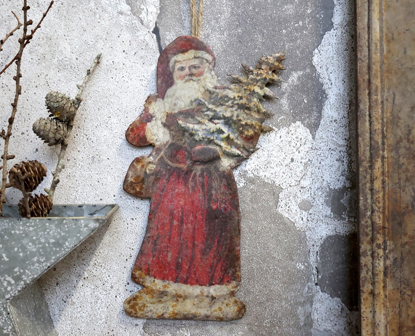 Hübscher Deko Vintage Weihnachtsmann aus Metall zum Hängen im nostalgischen Stil als Advent- und Weihnachtsdeko. Der Weihnachtsmann im Shabby Stil ist perfekt als Wand-Dekoration und ein echter Hingucker. Das Motiv ist nur auf einer Seite, die Rückseite ist schlicht braun.